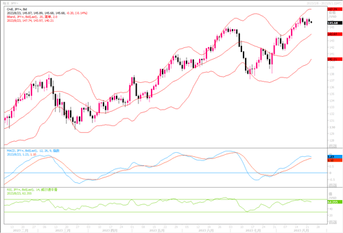 周二(8月22日),美元兑日元下跌0.24%,但距离上周触及的九个月高位不远。由于美元兑日元越来越接近上年日本央行出手干预的水平,因此交易员谨慎度继续提高,美元兑日元开启了高位震荡走势形态。就基本面来说,由于日本央行在推动其货币政策转向的行动上迟缓,退出负利率更是毫无时间表,而美元利率则有望保持高位甚至还有提升希望,两国货币利率差的持续扩大,不得不迫使交易偏向于美元,从而将套利交易模式延续下去。此前7月,被誉为日元先生的前日本财务省副大臣神原英资称,随着日本央行坚持超宽松货币政策,而美联储进一步提高利率以抑制通胀,日元可能会从当前水平上贬值10%以上。而且今年似乎看出,日本央行对于干预并不迫切。因此,美元/日元的上升空间仍可想象。短线4小时图上观察,似有双顶形成之嫌,需防范获利交易打压下的进一步回落调整风险。下方支撑仍要看145水平,若跌穿,恐怕会削弱进一步上涨动能。而如果能僵持在上述水平之上,则后市存在继续攀升至更高水平的潜能。
