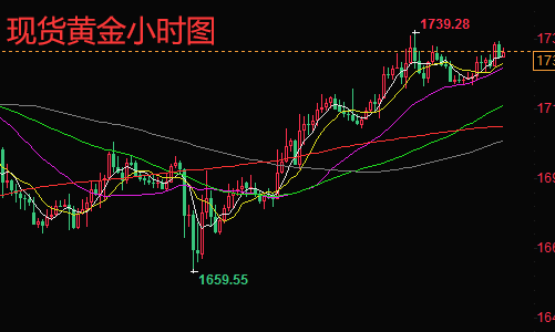 现货黄金从技术面,日线图上来看,布林带三轨逐渐向上发散,黄金价格运行在布林带中轨和上轨之间,均线收金叉上扬,多头趋势偏强,上方先关注昨天高点1738高点突破情况,破位继续上看1745-47一线阻力,下方短期关注1720一线支撑;现货黄金从四小时图上来看,布林带三轨持续发散,黄金价格依然运行在布林带中轨和上轨之间,上方有突破动能,均线依然是收金叉上扬;现货黄金从小时图上来看,布林带三轨逐渐走平,黄金价格运行在布林带上轨附近,目前已经突破上轨持续发散,均线依然收金叉上扬。综合来看,今日晚间短线操作思路上陈文龙个人建议以回调做多为主,反弹高空为辅,上方反弹到1738-40附近不破可以布局短空,破位等待1745-47再布局空单,下方回调到1722-24附近分批布局多单。