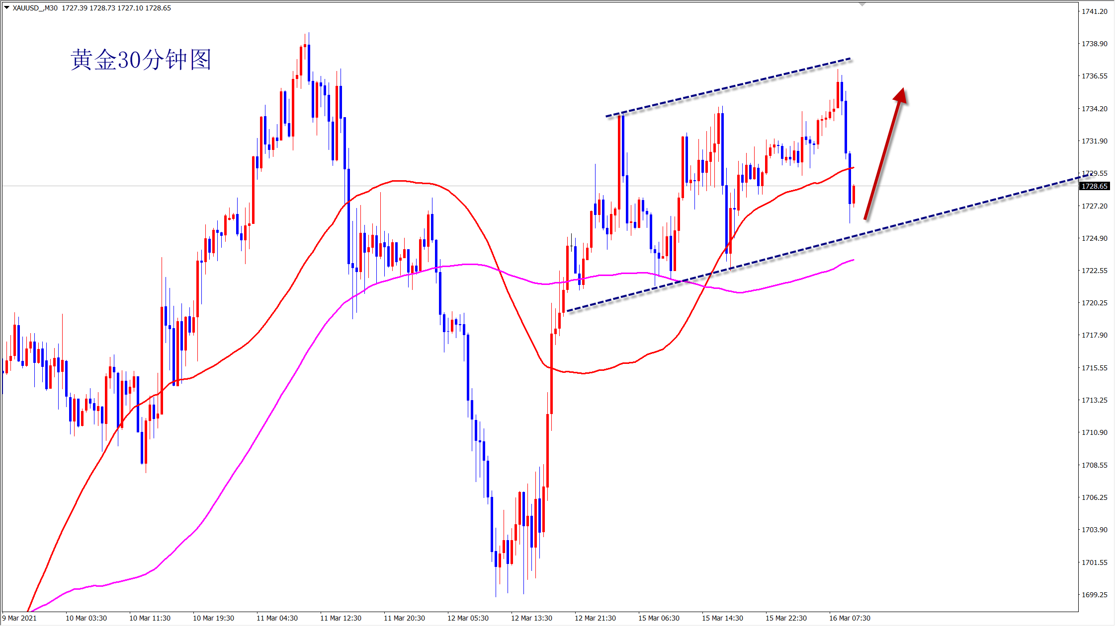 黄金今日亚盘运行节奏缓慢,午后行情冲高回落,但是依旧是多头反弹上涨走势,欧盘依托1722支撑继续干多,当前回落就是机会,多,直接多!