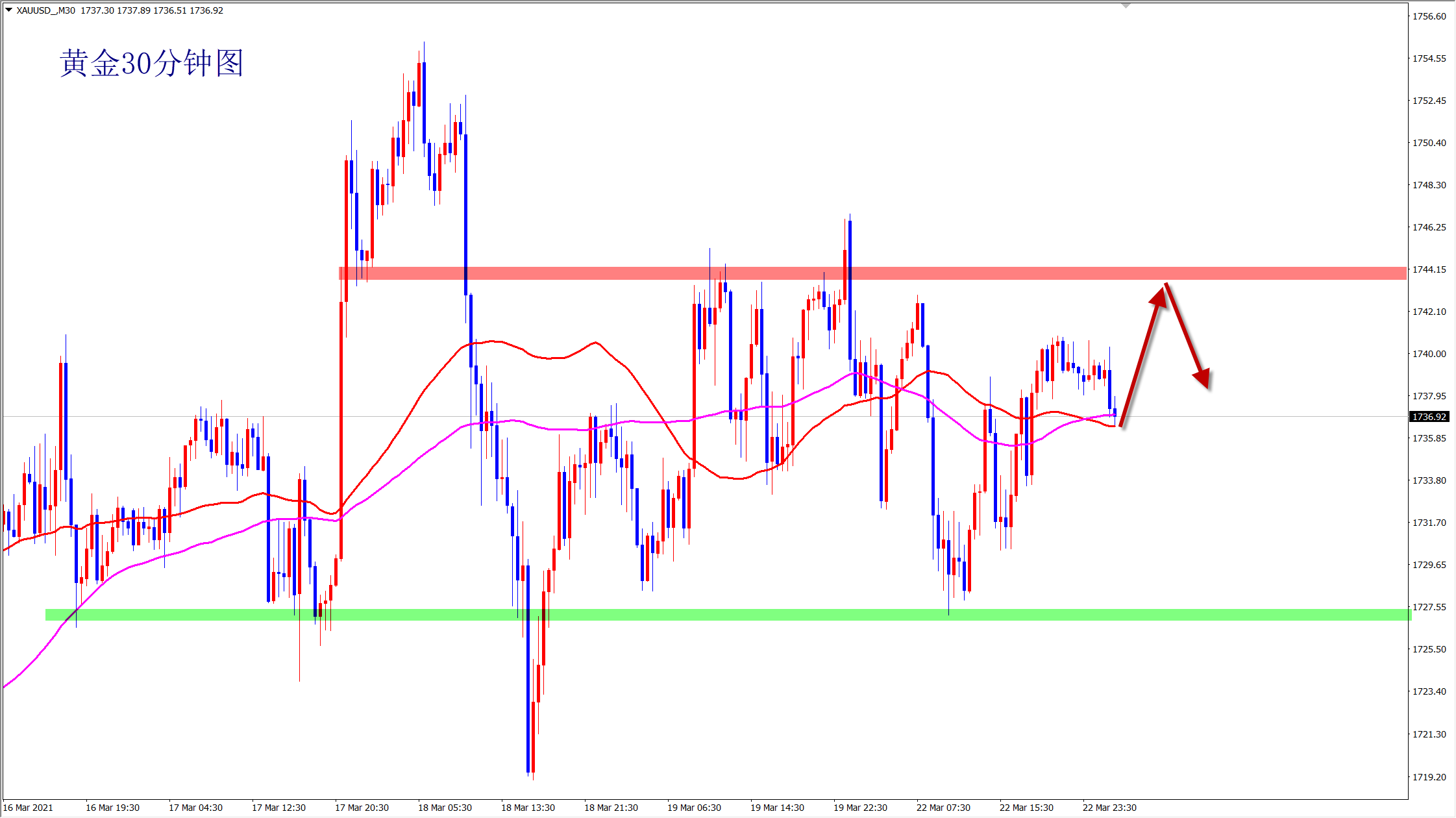 早盘黄金回落先多,1735下方靠近1730区域先多,上方分别关注1745压力1755压力和1760区域,遇阻的情况下可以反手空!