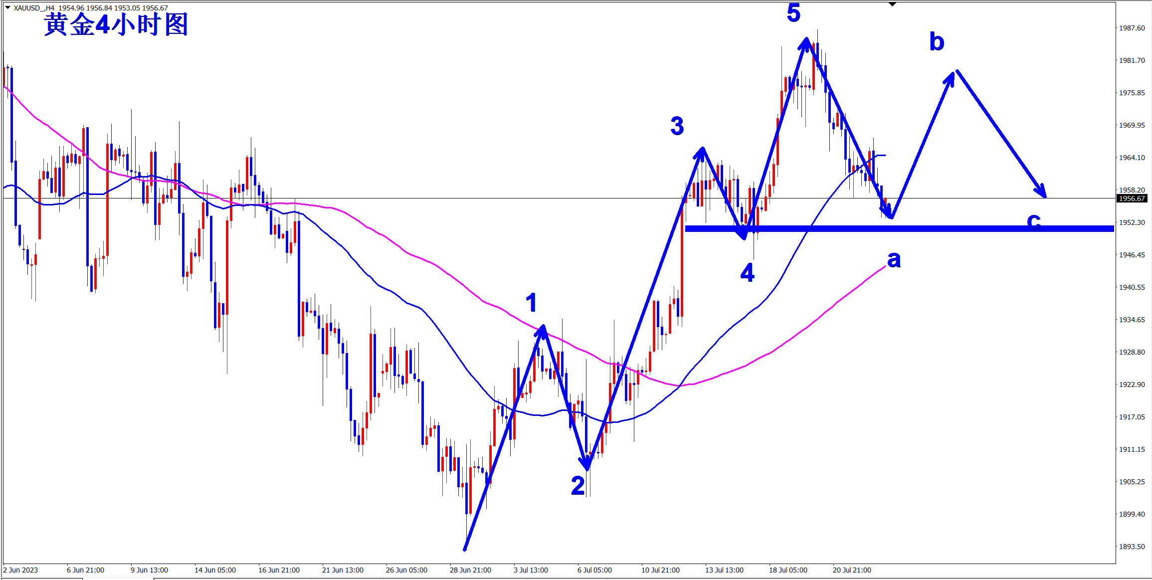 黄金4小时级别上从1893位置开始上涨至1987一线,是明显的5浪上涨结构!因为1987位置遇阻,所以现在行情开启调整走势,大概率将会是abc的调整浪,而现在a浪下跌已经完成!