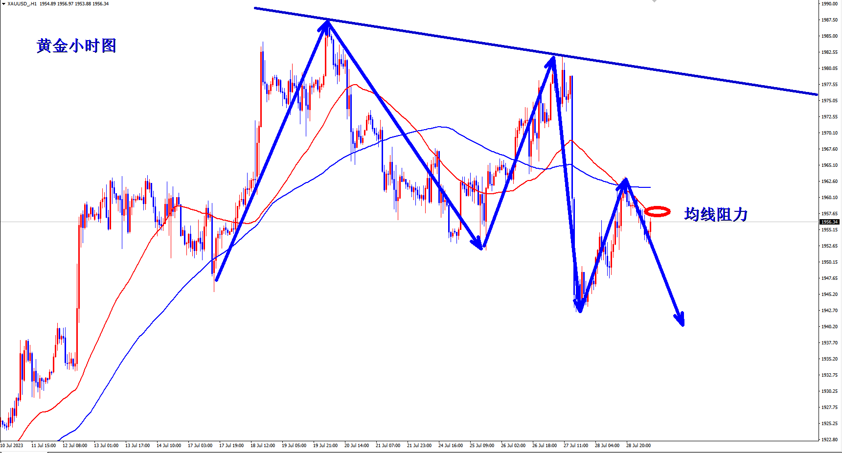 黄金1小时图双顶结构,均线死叉向下,顺势直接干空了,午后现价1957附近均线阻力附近直接空。趋势一旦形成,就不会轻易反转,反弹就是给干空的机会。