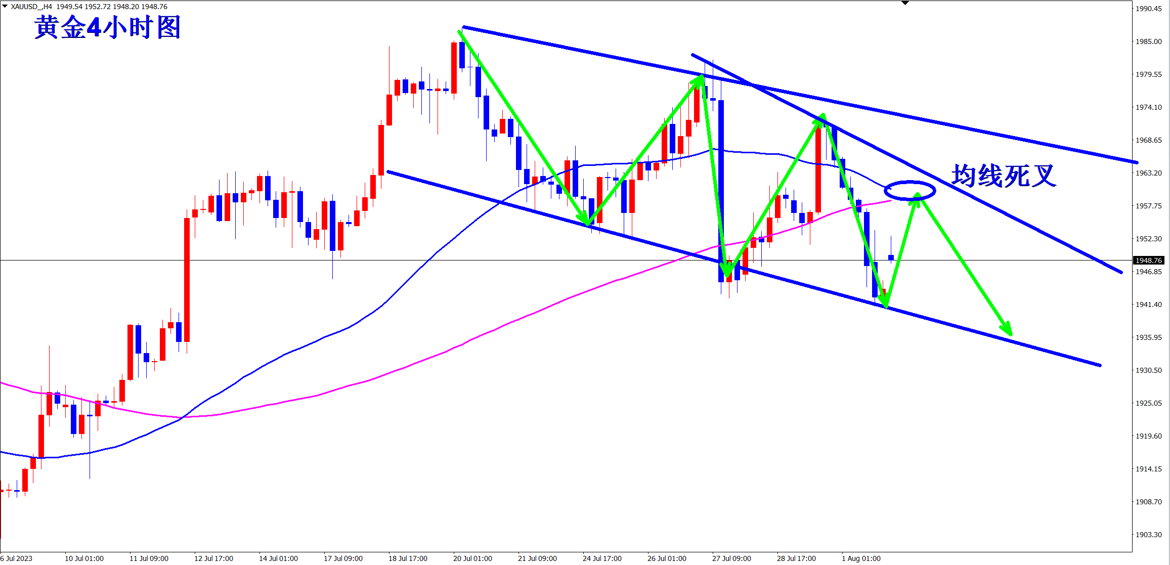 黄金4小时级别上看,高位形成双顶结构后,重心不断下移!昨日继续破位均线支撑,而且现在4小时级别均线即将形成死叉,这是空头趋势开始的标志!反弹都是做空机会!当前的压力就是高点连线和均线死叉的1960位置!