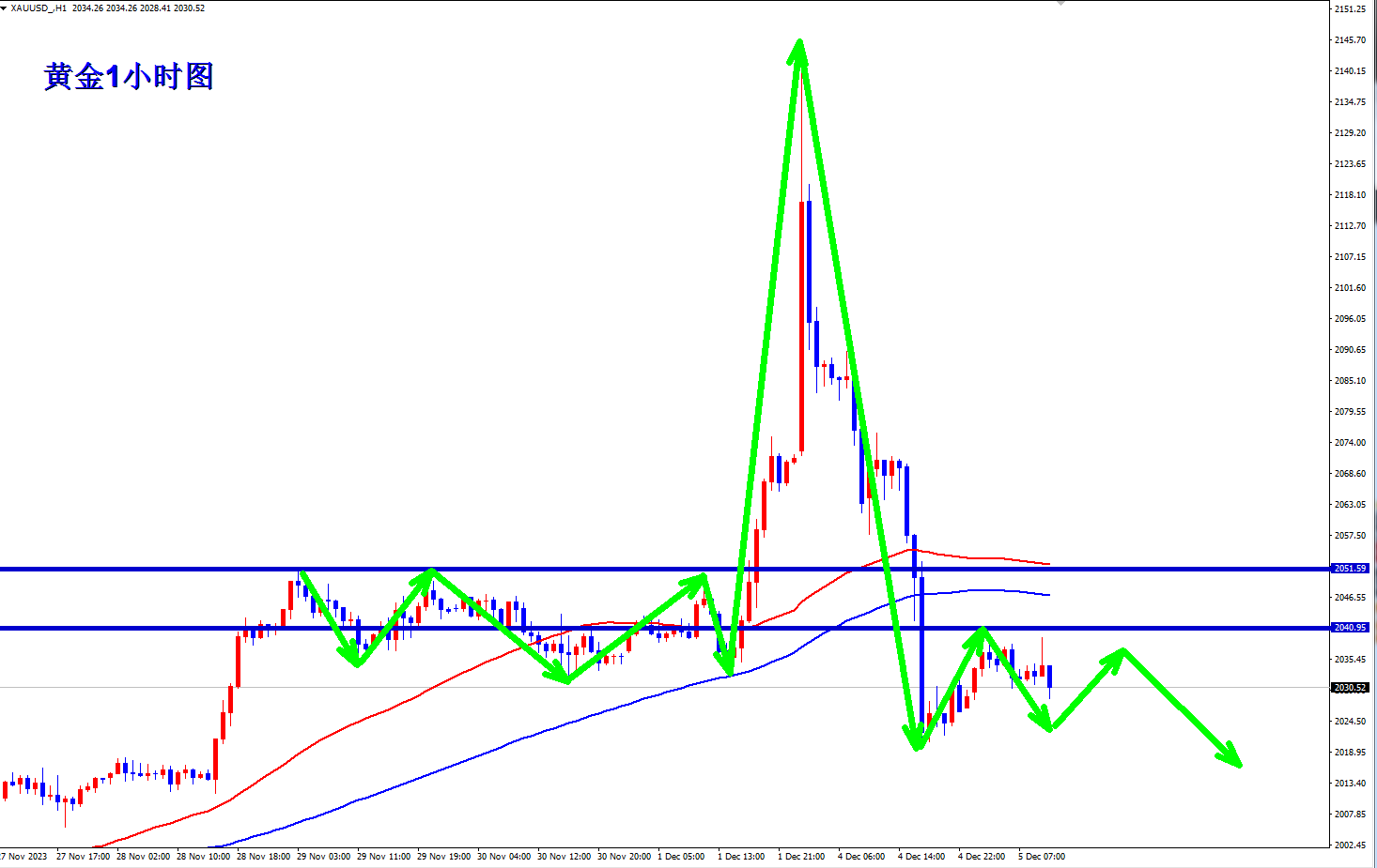 黄金1小时均线开始拐头,行情走势转弱,今天黄金两次反弹测试2040上方阻力无功而返,再次下跌,说明黄金现在依旧是空头的主场。黄金反弹2040阻力下继续逢高干空,因为昨天大跌,今天行情就是走震荡下跌的走势,反弹2038附近可以继续先空起来。