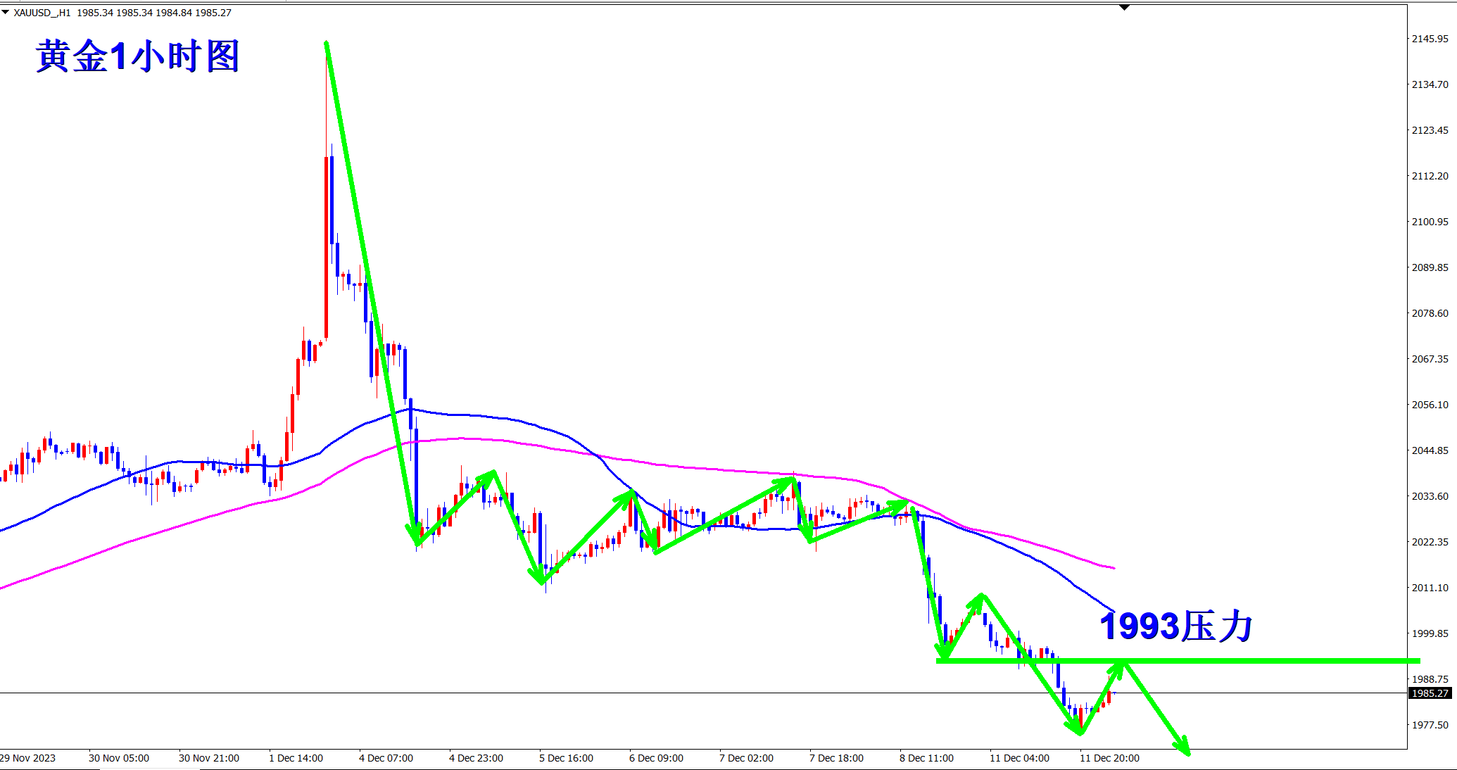 趋势下跌走势,顺势而为!当前黄金下跌趋势依旧没有改变,1小时级别上,k线维持在均线下方运行,没有突破均线压力前,反弹都是做空的机会!当前的关键压力就是昨日震荡压力1993一线!