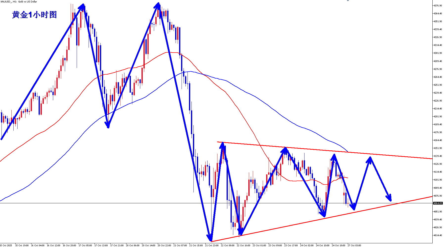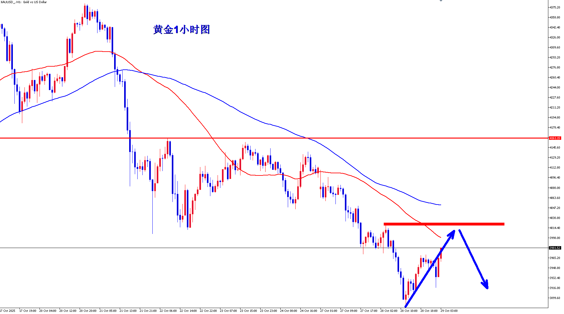 黄金1小时均线继续死叉向下的空头排列,黄金下跌还有动能,黄金跌破4000之后,短线反弹4010附近继续承压回落,黄金多头没有什么力度,黄金早盘反弹承压4010附近可以继续顺势空,不过现在波动幅度较大,如果黄金多头突破了4010,那么上方继续关注4050附近阻力就可以了,黄金整体走势还是继续偏空下行的走势,反弹就是给空的机会。