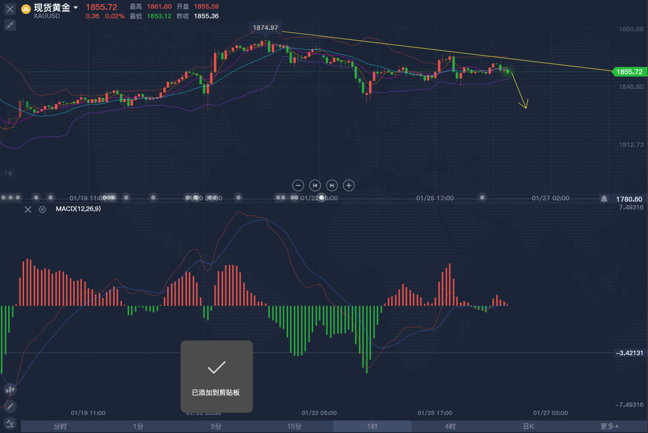 所以,短期的操作仍然还是以区间博弈为主,不用做过多的长线准备,时间和空间方面时机不成熟,日线方面的持续压制,可能会导致短期金价继续走弱,重点关注1848、1838支撑位置的,失守之后就能够延续一波空头。