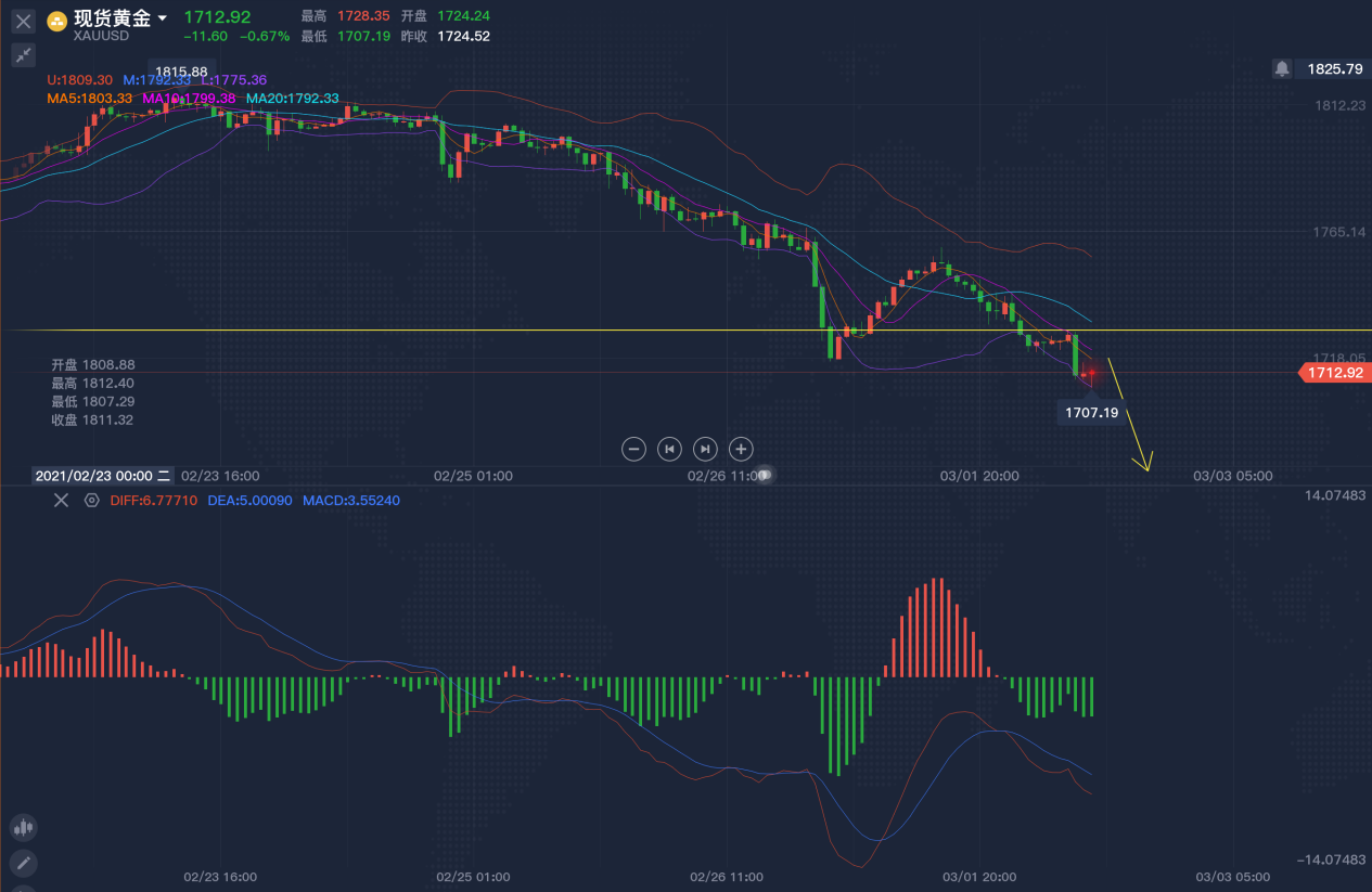 隔夜,金价迎来了一波下跌,跌至1707美元/盎司的位置,距离破位1700美元一步之遥,此次金价下跌的持续性时间较长,从2020年的8月份开始,一直到现在维持了近4个多月的时间,而且到现在空头还没有止跌的迹象,未来可能向1650-1600的区域迈进,放弃做多的想法,仍然坚持顺势跟进空单。