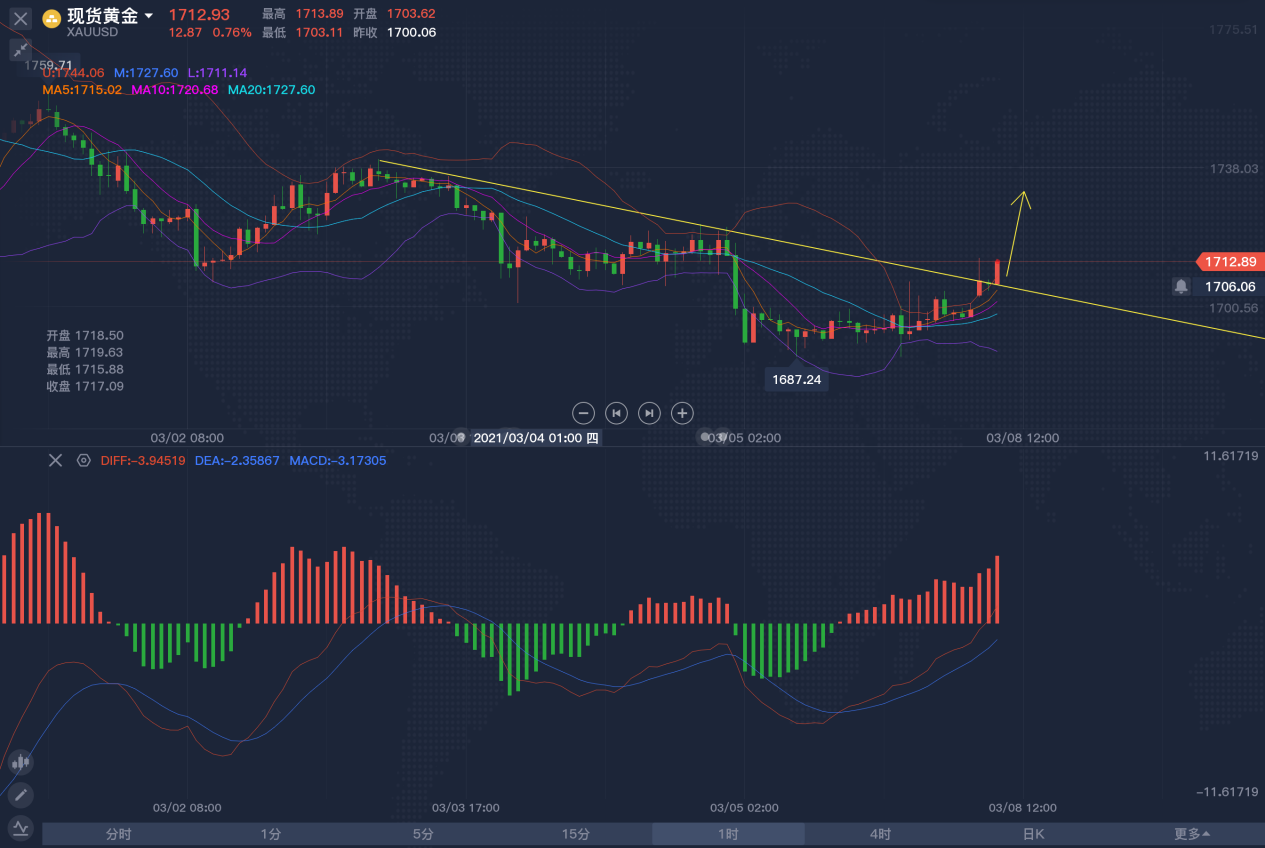 黄金:1712-1713直接多,损在1705即可,目标1725-1730。