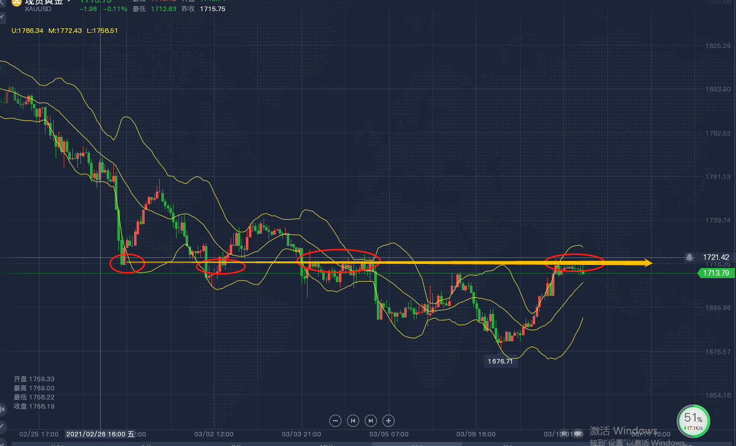 4小时来看,黄金目前处于昨日提到的阻力位置,同时也是顶底转换的位置,也就是1715一线,围绕着1715持续震荡,金价已经从布林带下轨反弹至中轨上方,K线收在5、10日均线上方,亚、欧盘暂时先关注这一线阻力位置的争夺情况,但从目前情况来看,持续回落的可能性较大,上方阻力关注1720一线,支撑位关注1688附近。