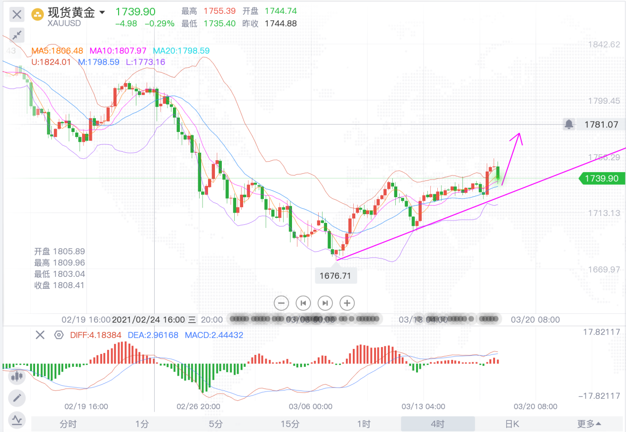 如图,这一轮金价强势拉升到1755的高点,暂时自1755快速的回落,重新回到了1740的下方,但4小时方面并没有表现出来明显的见顶走势,既然这个下调错过了,那就不用急着追空,估计调整之后还是个震荡,然后再向上拉升,调整后的支撑在日线中轨的位置,借此机会到时候安排多,防守的位置则是在1723的点。