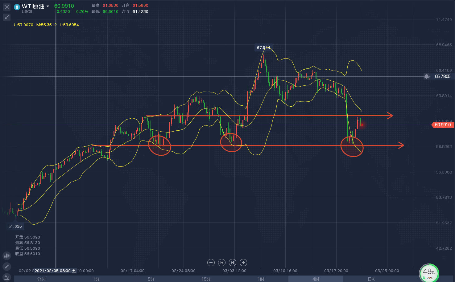 原油上周四大幅回落,油价从64.7附近回落之后一路加速下跌,周五虽然有所反弹,但反弹幅度较小,但整体走势上已然有见顶趋势,日线进一步看调整。原油从四小时来看,早间开盘走了一个回落反弹,整体走势还是比较弱,日内关注上方布林带中轨62-62.5附近的压力位置,下方关注58.8-59.2一线支撑位置,尽量以反弹高空为主。