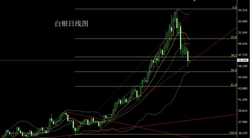 白银市场昨日低开在48.324的位置后行情先回落给出47.481的位置后行情强势拉升,日线最高触及到了48.686的位置后行情强势回落,跌破本轮上行斐波那契的38.2支撑后行情加速下行,日线最低给到了46.021的位置后行情受到支撑整理,日线最终收线在了46.874的位置后行情以一根下影线长于上影线的大阴线收线,而这样的形态收尾后,下方37.8的多和38.8的多跟进在42持有。今日48.1空止损48.4下方目标看47.3和46.5和46.
