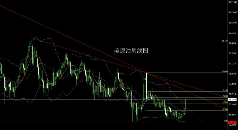 美原油市场上周开盘在61.106的位置后行情先回落,周线最低给到了60.186的位置后行情强势拉升周线最高触及到了66.537的位置后行情整理,周线最终收线在了65.789的位置后行情以一根下影线稍长于上影线的大阳线收线,而这样的形态收尾后,本周64多止损63.7,目标看65和65.5.