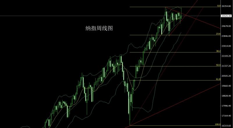 纳指市场上周低开在25322.44的位置后行情小幅回踩给出25265.35的位置后行情先拉升给出26221.73的位置后行情强势回落,周线最终收线在了25525.38的位置后行情以一根上影线极长的倒锤头形态收线,而这样的形态收尾后,本周25780空,止损25840,目标看25600和25500和25400.
