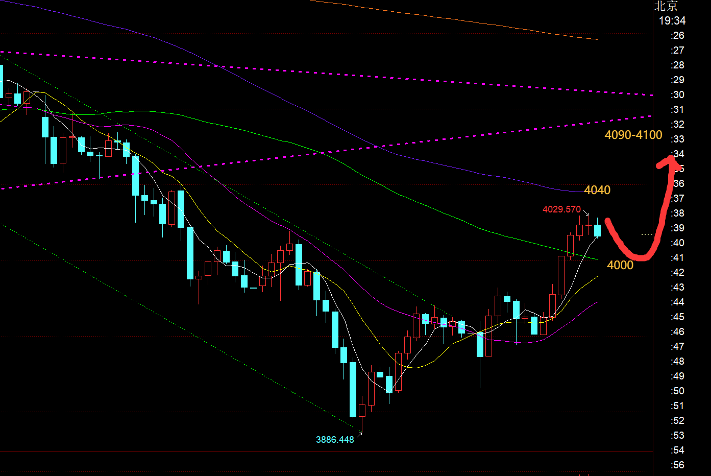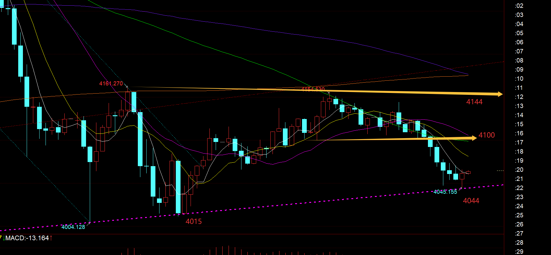 第三,黄金4小时级别:继续关注中轨压力得失,此时下移4095,只有某一刻突破站上它,此周期才能转强,支撑留意4004上;