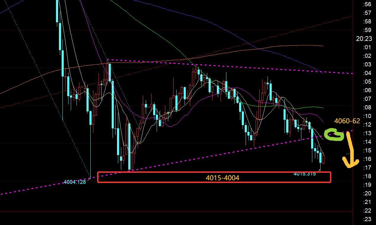 第四,黄金小时线级别:从上图看,底部收敛三角今日欧盘期间连阴向下破位,那么美盘前后先反弹一波,容易诱多,存在二次下行,关注通道反压点4060上下承压短线看跌,下方支撑4015和4004,若失守4000关口,则留意3975、3945,极限3914上;个人认为下方空间是不大的,或者时间是不长久的,2小时,4小时届时都会处于底背离状态,拉低是很容易突袭超跌反弹的;所以,不反弹到位之前,尽量也不去追跌;另外,若价格又突破4060上行重新回到收敛三角内,要么它扩大收敛范围继续整理,要么慢慢企稳上攻,届时就不能盲目看跌; 因此,今晚要去二次看跌,收盘一定不能重新回到图中紫色三角之内,而要低位看涨则需等二次下跌走完或靠近提及的几个支撑出现稳定信号再考虑;