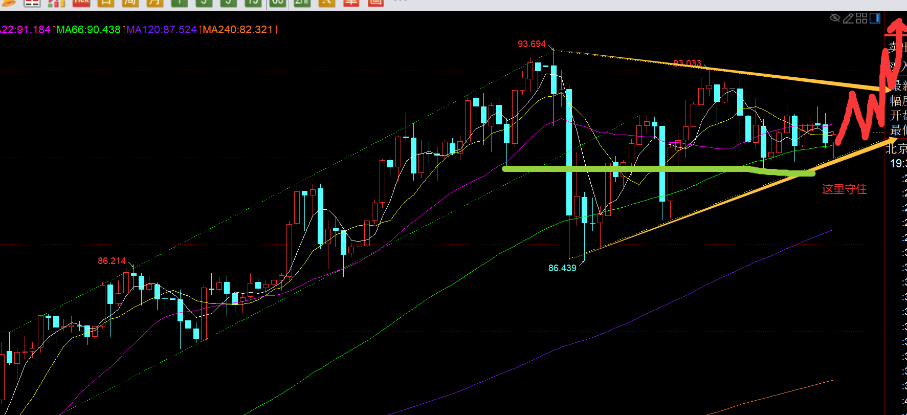 白银方面:日线昨日依托5均线探底拉升,收报长下影K,属于回踩确认,今日再次依托5均线89.5上支撑企稳,强势单边拉升格局依然存在,继续北上为主; 当前从图中看,已演变为高位收敛三角,今晚守住下轨90一线,就有望试探上轨92.4,一旦有效突破上轨,则会再刷历史新高的可能,而早间低点89.5是不能跌破的,不然会形成高位箱体的整理过程;