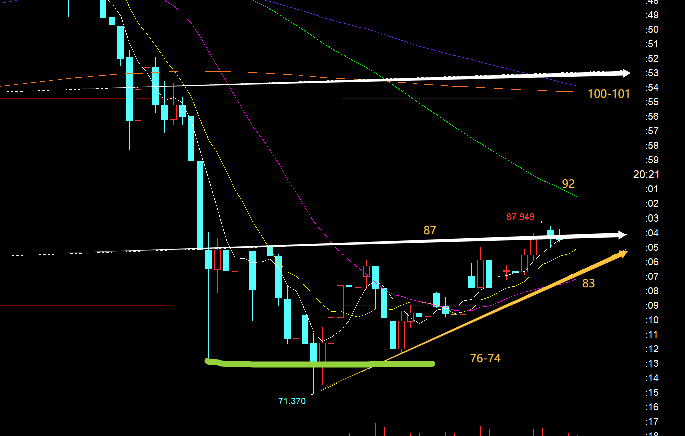 白银方面:昨日收报长下影小阴K,也是靠近66日均线有所企稳,70-71上支撑相对强烈,符合周视频提及的炒底点;日线中轨阻力92, 5均线阻力96-97, 10均线阻力99-100都是后市反弹会承压的位置,由于白银砸的比较猛,想要直接V回去概率极低,需要一定时间的来回往复试探,但最终依然会迎来逼仓行为,继续强势单边走高,因为库存始终处于下坡路;当前从图中看,刚好卡在白色通道下轨线上,86-87阻力位横盘测试中,今晚若能连阳站上,可以向上测试92等阻力;反之,站不上,则容易冲高回落,下方支撑83,这里若失守,还可能有机会试探76-74,当然拉低是可以北上的;