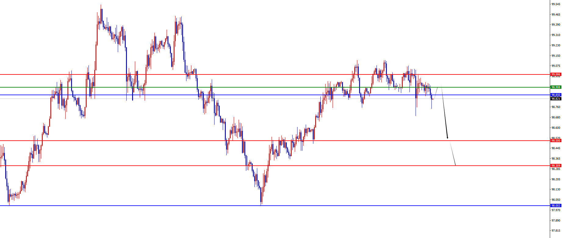 从多周期分析,周线价格经过前期持续震荡但是整体受撑于周线关键位置,目前周线支撑于98区域,后续关注进一步中期多头(需要注意缺口位置)。从日线级别看,随着时间的推移目前日线阻力于98.80区域,此位置是波段走势的关键,目前价格已经进行下破,后续关注此区域持续承压。四小时级别看,昨日价格持续承压于四小时阻力位置,随着时间的推移目前四小时阻力于98.70-80区间阻力,后续关注此区域继续承压即可。