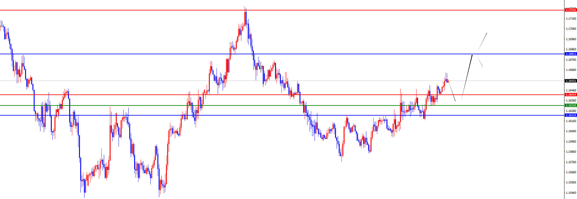 从多周期分析,从月线级别来看,欧美受撑于1.1100位置,所以价格在此位置之上长线多头对待。从周线级别看,周线阻力于1.1680区域,此位置是中线走势的多空分水岭,价格在此位置之下中线偏空对待。从日线级别,日线上是我们强调波段走势的关键,价格在上周五突破1.1620阻力位置,后续关注价格延续上涨。从四小时级别看,价格在上周四晚间突破四小时阻力位置,之后价格维持短期上涨,目前四小时支撑于1.1630-40区间支撑,后续关注此区域支撑价格继续上涨,上方重点关注日线阻力1.1680区域得失,一旦上破则关注进一步延续,后续我们再做实时跟踪。