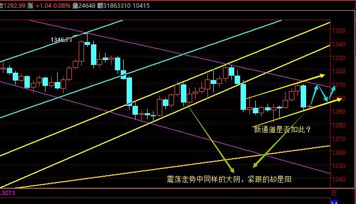 昨日提出重要两点:第一,日线压制大通道关键趋势压力1312,守住不破将迎来一波下探‘结束连阳反弹;第二,小时线出现双背驰压制,佐证看空下行;只是唯一没意料的是下跌力度超乎预期,原本计划1296-97差不多,半夜最低下探1289才企稳盘中,周三给出1304多,于1308-1310盈利、1303空,于周四1299盈利后,美盘给出1297震荡看多,半夜被损92出局;对于今日来讲,虽然昨日日线大阴,但笔者认为日线只是换了一个上行通道,昨天的低点应该是下轨的某点趋势支撑,对于震荡走势中,大阴之后往往容易出阳,今日先直接看涨再说,大阴出现后,市场原本看多的人会调头去反弹空,这往往会陷入圈套,守住1290,今日逢低先看涨,1299-1300是关键压力,若突破上攻,或许昨日的跌幅会收复;