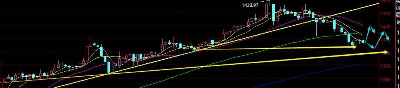 昨日亚盘继续大幅上拉,触及1439后欧盘出现一波杀跌,美盘支撑1424后再次反弹至1436,随后半夜遭受美联储官员讲话利空刺激,破位1420,最低延续今日1403一线,那么从日线级别形态看,前面连阳延续5均线一路强势上拉,今日算一次出阴,不足以改变多头趋势,只是短线出现快速调整而已,预计依托5均线或虚破下还是会反抽上去,不过跌幅过大,1439暂时突破不了,需要几天时间震荡,日内支撑1405-1400这两个位置是关键,阻力1412和1418、1425,依托前期支撑以及分割点,拉低仍旧可布局低多,而欧盘的强弱是关键,若欧盘能反弹回到1412上方,那么美盘回测后还有进一步的拉升;若欧盘像目前反抽无力,低位横盘的话,晚间可能还有进一步的下挫才会反抽的高;