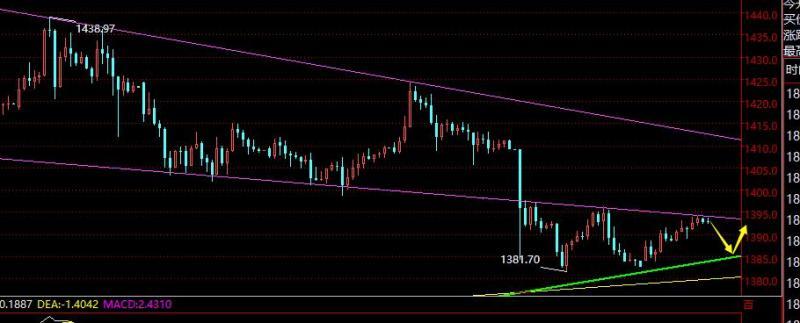 隔夜压制1396走了连续性的下跌,今日亚盘并未延续这样的弱势,而是支撑1382.5走了一个震荡一路上行,再次受压趋势小通道阻力1394,按照美元反弹和白银下挫看,黄金今晚还是存在下跌延续的跟随,不过有一点不是很好,就是欧盘一路震荡上行,美盘可能还有一次诱多拉升的走势,看力度如何,不管怎么,黄金日线昨日大阴后,今日短期均线明显死叉,今晚反抽都是压制高空为主,出现意外的话极限1400下做空,正常走势的话1394就应该是暂时的高点压制,下方关注1385,由于震荡走势,见好就收,不看远,破了再去进一步的下看;