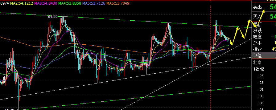 黄金的不断反复整理,也造就了油价的反复震荡修正,因为它们俩近期走反概率极大,前晚探底拉升,日内按照趋势支撑布局了一次多单,也成功一路上涨获利,最高冲击54.8美元,刺破55、54.7所连接的趋势阻力线,并未站上,那么今日依旧围绕区间日展开,上方阻力位54.5,站上才能冲击55上,下方趋势支撑53.65,逢低做多,卡两边操作,黄金压制冲高回落,原油则可以入多看反弹,个人认为原油有希望加大反弹的修正力度,最大可以试探日线级别的通道压力57-56.9阻力,也是后市中空的位置;今晚EIA库存看能否打开震荡的局面,也会一定程度上联动黄金的反向运行;