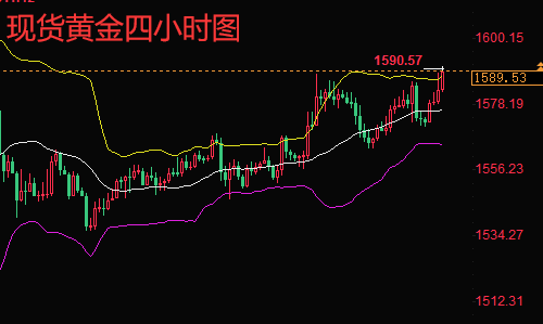 黄金4小时来看:黄金V型反弹:MACD金叉,红色动能柱显现并扩大,KDJ金叉,随机指标大幅走高,指示黄金短线上行动能强化,接下来料继续扩大涨势。黄金出现进一步的突破行情,一举突破1588压力,价格最高到达1590美元上方附近位置,目前处于1570上方位置进行震荡上涨,整体黄金多方走势十分强劲。近段时间金价维持震荡上行走势,1560和1570均线提供稳定支撑效果。综合来看,下周一操作思路上陈文龙个人建议以回调做多为主,反弹高空为辅,上方短期重点关注1595-1597一线阻力,下方短期重点关注1580-1582一线支撑。