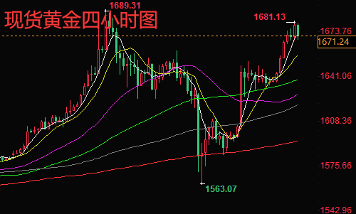 现货黄金从4小时来看,在此前暴拉超50美元后,金价再上一层楼,隔夜一度攀升至1675美元上方,关注能否击穿此前的近8年高位。技术面来看,MACD红色动能柱持稳,KDJ随机指标触及超买水平后,关注短期盘整的可能。昨晚美盘时段进一步刷新本周的高点,并且企稳1650上方后继续爆发,午间再次冲高回落,摆脱了早盘的震荡高位修复,不过也要注意周五空间的考虑,追多依旧需要谨慎。综合来看,今日短线操作思路上陈文龙个人建议以回调做多为主,反弹高空为辅,上方短期重点关注1682-1684一线阻力,下方短期重点关注1662-1664一线支撑。