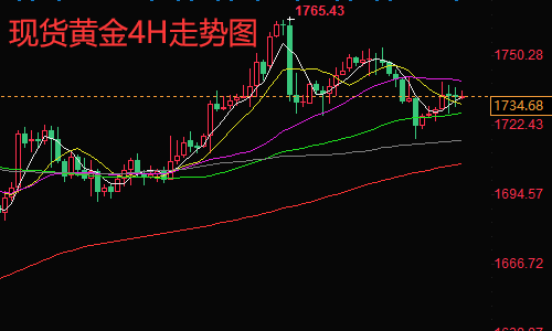 黄金技术面分析:本周五黄金价格在冲高之后回落,主要原因也是受到股市下跌的影响,价格在回落之后反弹受到MA20线压制,没有得到有效突破企稳,但是技术面上面临的回落风向相对较大。短线4小时走势来看,价格MA5日线刺破10日线,形成短暂回调局面,价格在触及下轨之后得到反弹,回到本周初1750-1718震荡区间,当前KDJ三线继续向下发展,MACD背离,绿色动能柱开始放量,上方借助1735震荡区间的压力位,还可以看回调在1720附近,短线MA5日和10日线为改变结构前,价格都将处于回调节奏。