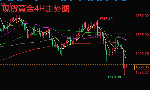 黄金在周五反转反弹修正之前两日大幅下跌后,今日开盘以来基本上再次延续弱势震荡走低;图K线连阴,MACD在零轴下方运行,说明当前价格仍然处于弱势中。从位置来看,价格最低走到1670区域,晚间企稳于1680一线,向下延续态势进一步明朗。但是目前已经没有合适的位置参与空头。所以1700区域成为日线多空分水岭位置,站稳此位置多头仍有希望,笔者文龙依然对黄金多头突破后再次上涨抱有期望,只是这一过程可能不会来的那么快。4小时来看,震荡反弹,MACD死叉绿色动能柱缩减,KDJ结成金叉,随机指标向上发散,指示黄金短线有反弹迹象,接下来将展开震荡之势。综合来看,下周一短线操作思路上陈文龙个人建议以回调做多为主,反弹高空为辅,上方短期重点关注1695-1700一线阻力,下方短期重点关注1675-1670一线支撑。