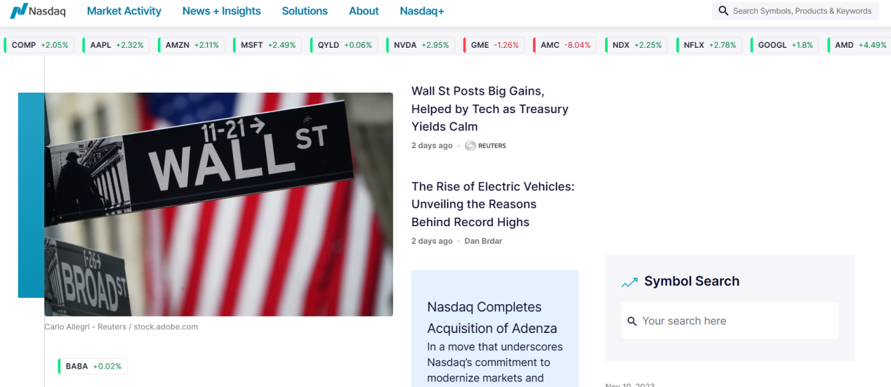 美国排名第二的股票交易所是纳斯达克交易所,简称NASDAQ,它是全球首个采用电脑+电话撮合交易的交易所(也叫做电子交易市场),在全世界共装置了50万台计算机终端,向世界各个角落的交易商、基金经理和经纪人传送5000多种证券的全面报价和最新交易信息,这与纽约证券交易所人工撮合交易形成鲜明对比。纳斯达克的上市要求中提到:公司净资产不少于1500万美元,最近3年中至少有一年税前营业收入不少于100万美元。这一点相比纽约证券交易所的5亿总市值和250万美金营收来说,更容易达成。所以,纳斯达克交易所吸引了大量的互联网企业入驻,并将纳斯达克100指数打造成全球科技行业的风向标。纳斯达克交易所目前拥有5416家上市公司,相比纽交所多出两千多家公司。但是,纳斯达克交易所上市公司总市值为16.2万亿美元,低于纽交所的24.1万亿美元。纳斯达克交易所市值最大的五家上市公司分别为苹果、微软、谷歌、亚马逊、英伟达,都是交易者耳熟能详的科技公司。