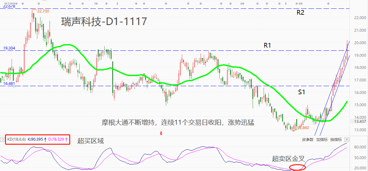 技术角度看,瑞声科技处于中期空头趋势下的反弹阶段,反弹持续时间和幅度均较大,已经具有趋势转折特征。11月3日至今的11个交易日,连续收出阳线,累计涨幅达到37.34%,表现出极强的上涨力度。市价运行于R1阻力位附近,该阻力位是二季度的震荡区间上限,有可能导致反弹走势终结并开启回落走势。K线运行于上升通道线内,在下轨被突破之前,维持偏多判断。MA30是反弹阶段能够延续下去的中期支撑。震荡指标KD的读数已经处于超买区间,行情有向下调整需求,建议对此保持警惕。