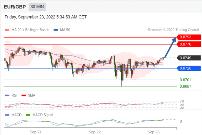 欧元/英镑 当日内: 看涨,当 0.8726 为支撑位。