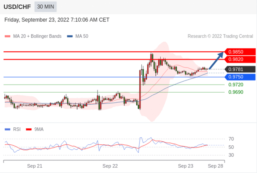 在 0.9750 之上,看涨,目标价位为 0.9820 ,然后为 0.9850 。