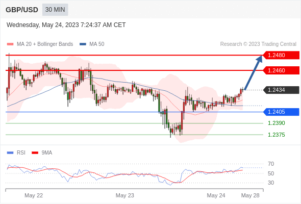 在 1.2405 之上,看涨,目标价位为 1.2460 ,然后为 1.2480 。