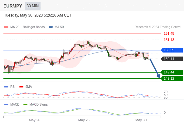 欧元/日元 当日内: 看跌,在 150.59 之下。