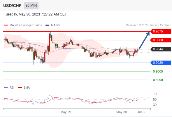在 0.9020 之上,看涨,目标价位为 0.9060 ,然后为 0.9075 。