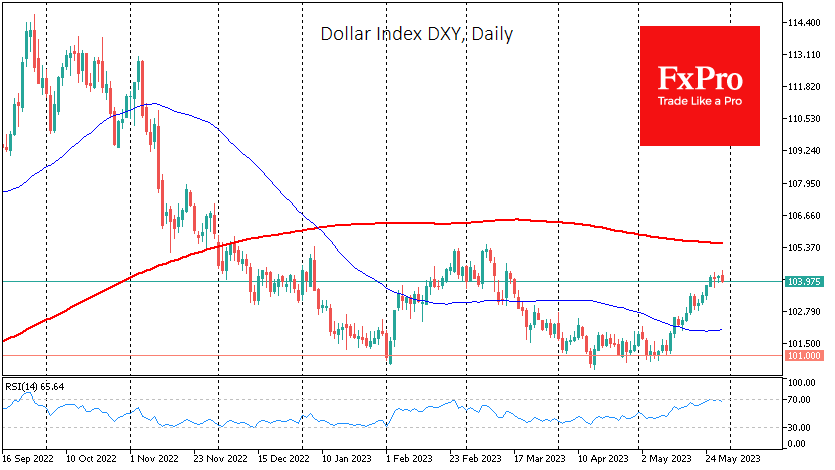 出现上述情况的主要原因是市场对美联储将在6月中旬再次加息的预期增加。截至本周二上午,出现这种结果的几率超过64%,而在5月初上一次反弹开始时几乎为零。加息预计将吸引资金流入美元,而在地区银行业危机期间,这些资金曾规避美元。