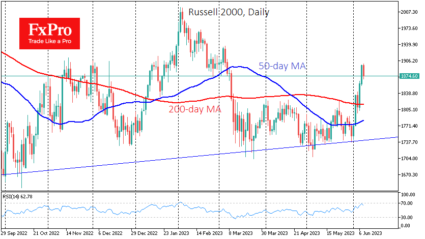 周三,美国股指出现了强劲但明显的背离,这种情况有点罕见。纳斯达克100指数周三下跌1.75%,回落至14300点附近,几乎抹去了本月初以来的涨幅。与此同时,小盘股罗素2000指数上涨近1.8%,达到三个月高点。