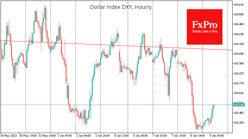 在最新趋势中,美元指数DXY在5月底从上边界反转后,现在正朝着100.5下方的支撑位前进。