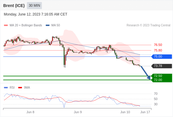 布伦特原油 (ICE)? (Q3)? 当日内: 朝72.50运行。