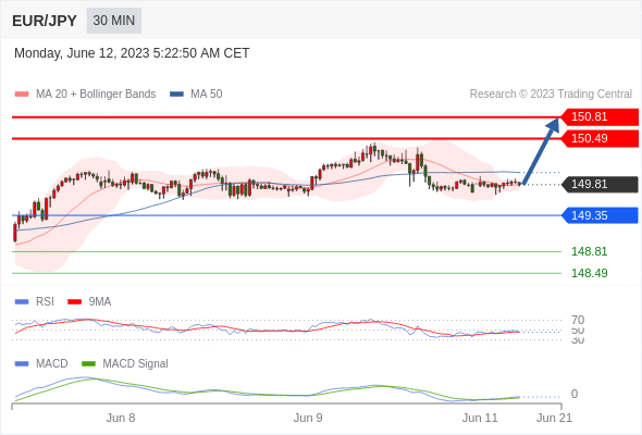 欧元/日元 当日内: 有上涨的可能,目标价位定在 150.81 。