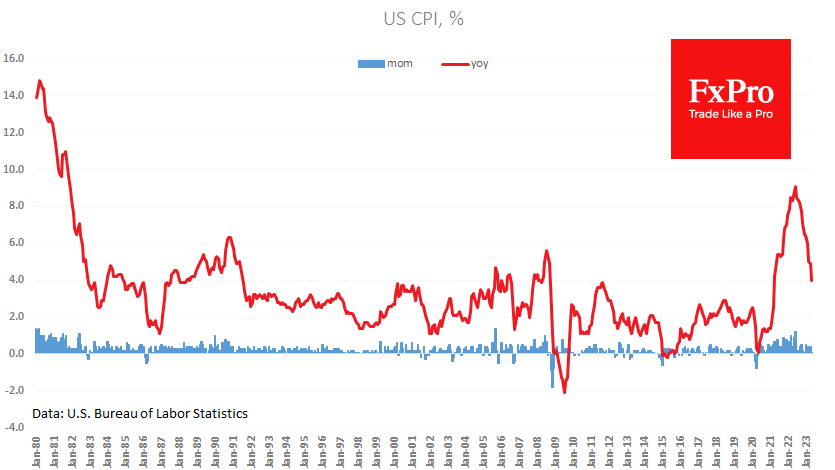 美国五月份消费者通胀率从4.9%同比放缓至4.0%。月度涨幅为0.1%。在这两种情况下,数据均比预期低0.1个百分点,标志着通胀问题的下降速度略快于预期。