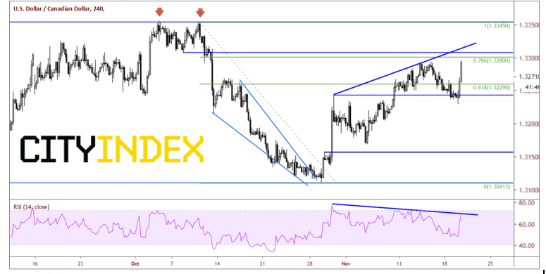 美元/加元今天上涨0.5%,但上方筑有强阻力(当然有阻力,价格正处于三角形的顶端!)。4小时图上,价格上攻10月10日高点到10月29日低点的78.6%回档位1.3280。其上还有以前低点形式构成的水平阻力位1.3290,而一根上涨趋势线就在1.3300下方。请注意价格的高点上抬以及RSI的高点下降。今天价格站上前高点,比其高出1.5点子。价格形成了3个上抬的高点而RSI出现3个下降的高点,这是市场发出的强警告,即价格可能反转。另外,200天均线落在1.3275。