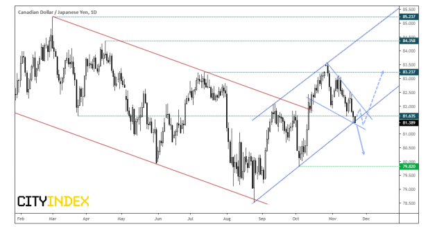 加元/日元:该货币对值得注意的是即将确认两个潜在形态是否失效:上涨楔形与上涨通道。我们在之前的文章中谈过上涨通道,且其完美地构筑10月整个反弹行情的顶点,而且价格现正考验上涨通道与上涨楔形的下轨。