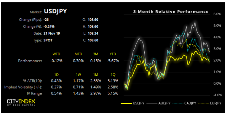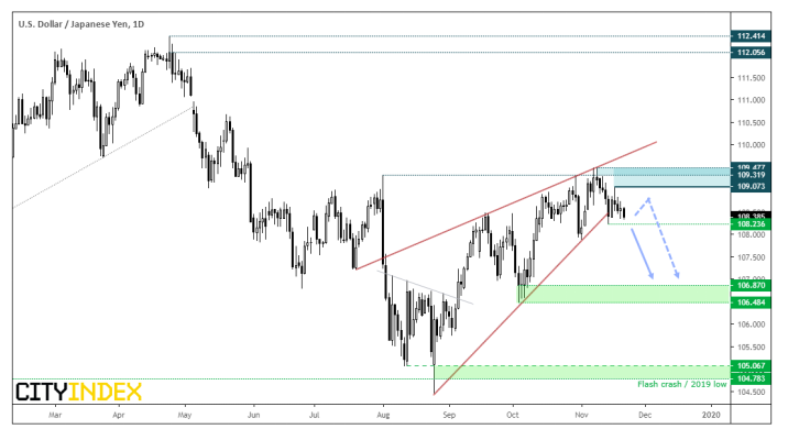 阶段1贸易协议达成的可能性似乎越来越小,几乎被推迟到明年。我们具备了贸易协议破裂的所有因素,与此同时股市继续交投于各自的历史高点下方而日元货币对正在考验关键低位。