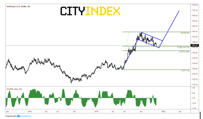 统上认为黄金与股市负相关,即股市下跌黄金上涨,反之亦然。我们可以在日图下部的关联系数震荡指标看到,周一就是这种情况。这个关联系数目前为-0.68(请参考,当关联系数为-1.00时,两种资产的走势在100%的时间里背道而驰)。在股市继续创下历史新高之际,黄金持续回撤。